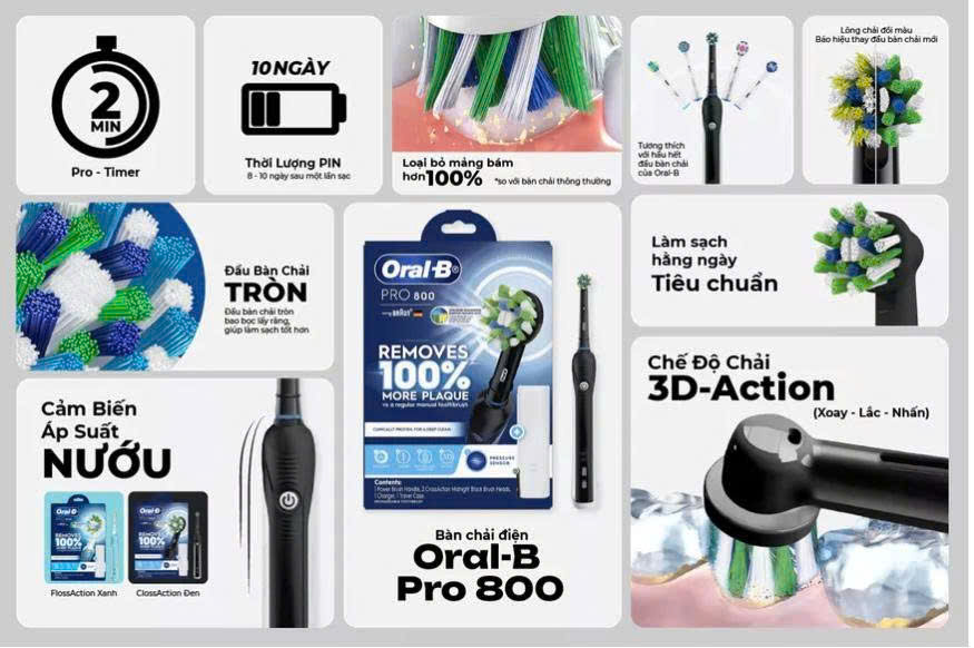 Bàn chải điện Oral-B Pro 800 (sạc điện) sạch mảng bám sâu kẽ răng