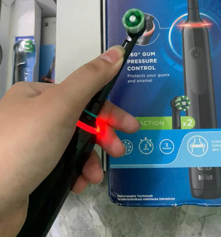 - Cảm biến áp suất thông minh: Bàn chải điện Oral – B Series 3 được tích hợp bộ cảm biến Visible Pressure Sensor có khả năng đưa ra cảnh báo nếu bàn chải tác động quá mạnh lên bề mặt răng. Đèn báo cảm biến 360 độ quanh thân (bản pro thấp hơn chỉ được 1 phần của thân máy).