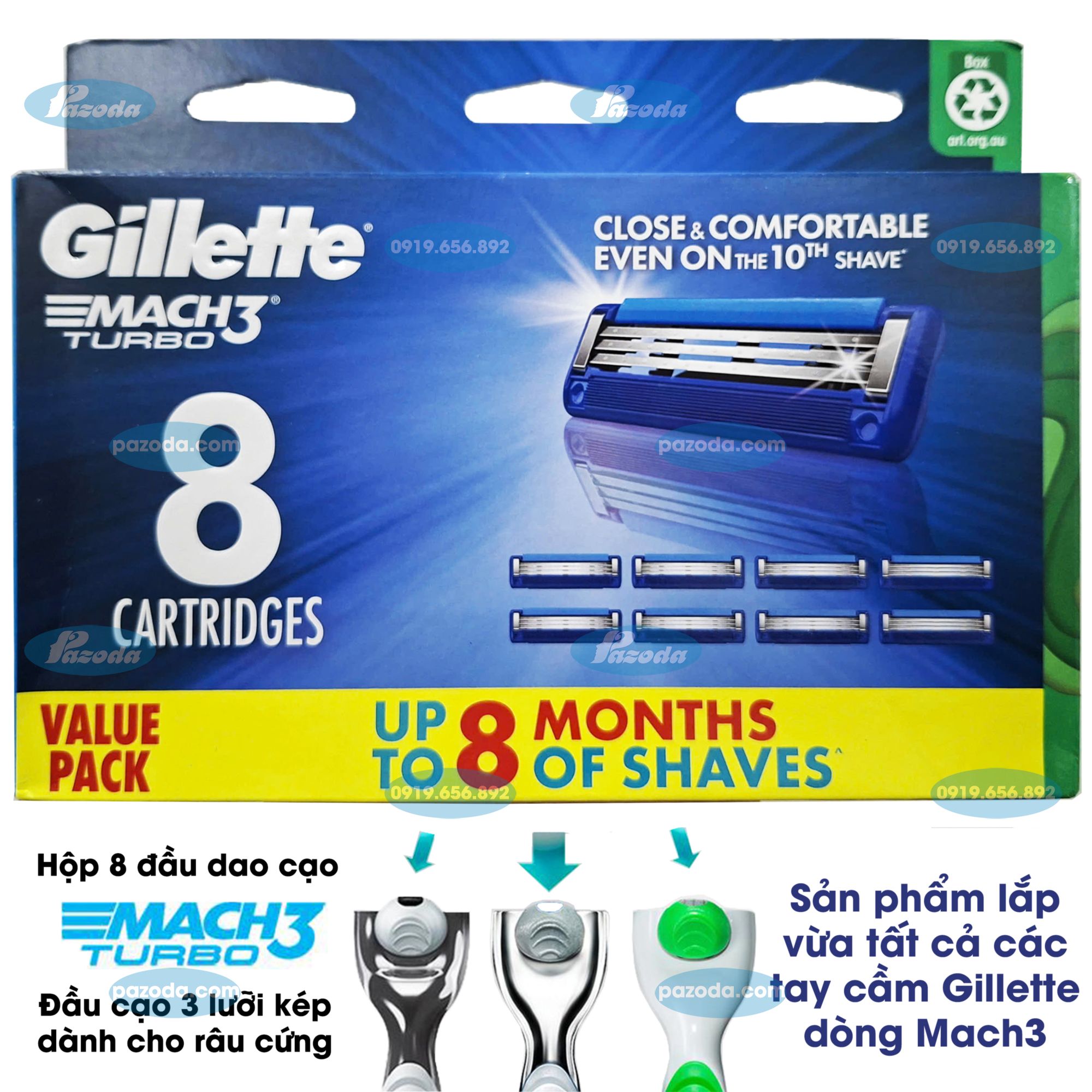 Hộp 8 lưỡi dao cạo râu Gillette Mach3 Turbo gồm 8 đầu cạo 3 lưỡi kép Gillette Mach3 Turbo phù hợp với tay cầm Gillette dòng Mach3.